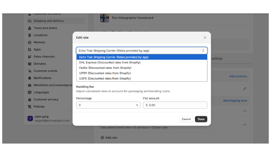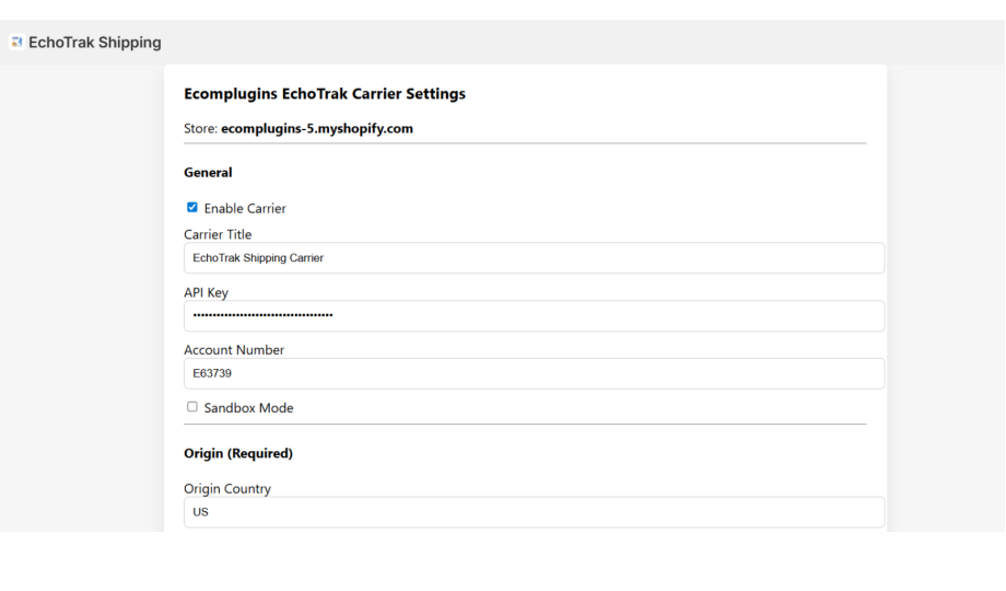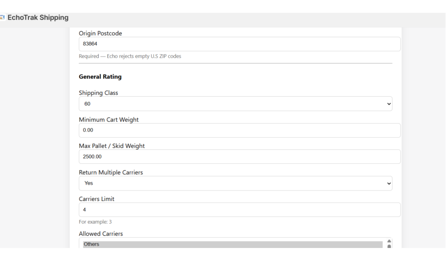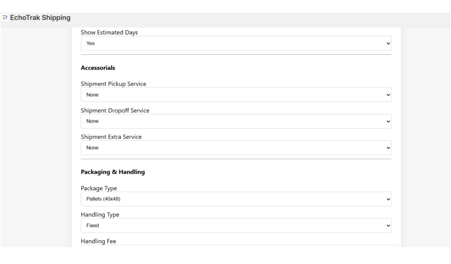Integrate EchoTrak shipping rates into your Shopify store. Calculate real-time shipping costs based on customer address and cart products. Configure residential or commercial delivery, liftgate options, carrier limits, markups, and estimated delivery dates. Assign product-level shipping classes and package types. Manage all settings easily from app page.